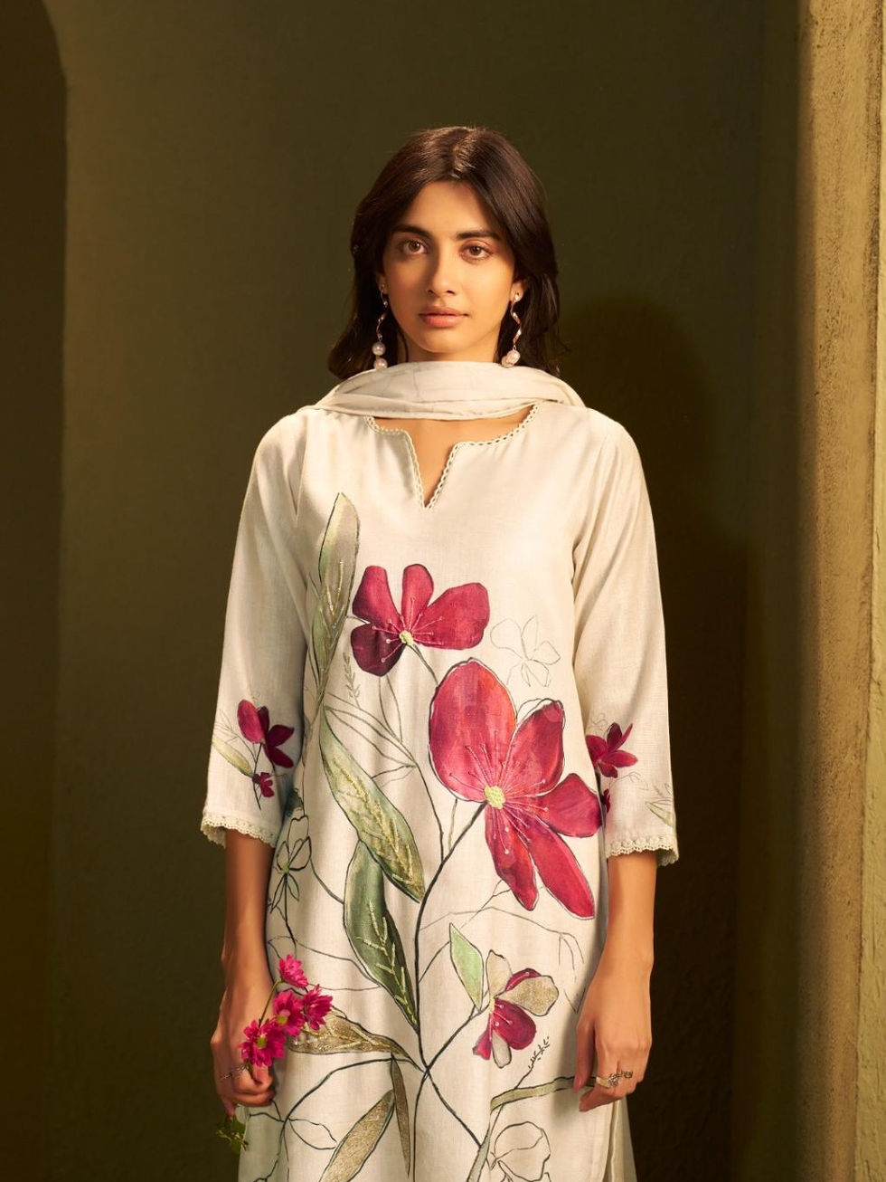 set is adorned with delicate hand-painted floral motifs in rich crimson and soft greens. Crafted in breathable fabric with a relaxed silhouette, it offers effortless elegance for both day gatherings and intimate occasions. Paired with a flowing dupatta, this ensemble is a perfect balance of comfort and sophistication.