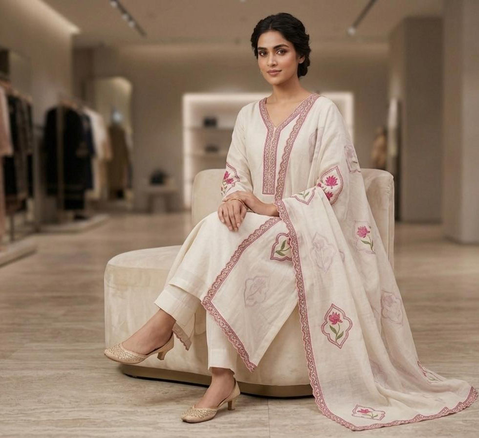 Radiate timeless elegance in this ivory cotton-silk ensemble. The kurta features a classic V-neckline adorned with intricate rose-pink embroidery that extends along the borders. Highlighted by hand-applied floral patches and a matching scalloped dupatta, this set is paired with tailored straight pants for a silhouette that is both traditional and effortlessly chic.
